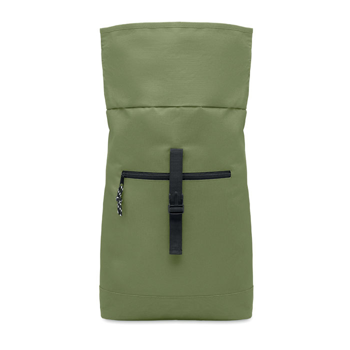 15-calowy zwijany plecak na laptopa typu rolltop z poliestru 600D z wyściełanym tyłem i wzmocnionym spodem. Przednia kieszeń zapinana na zamek. Podszewka 210D.