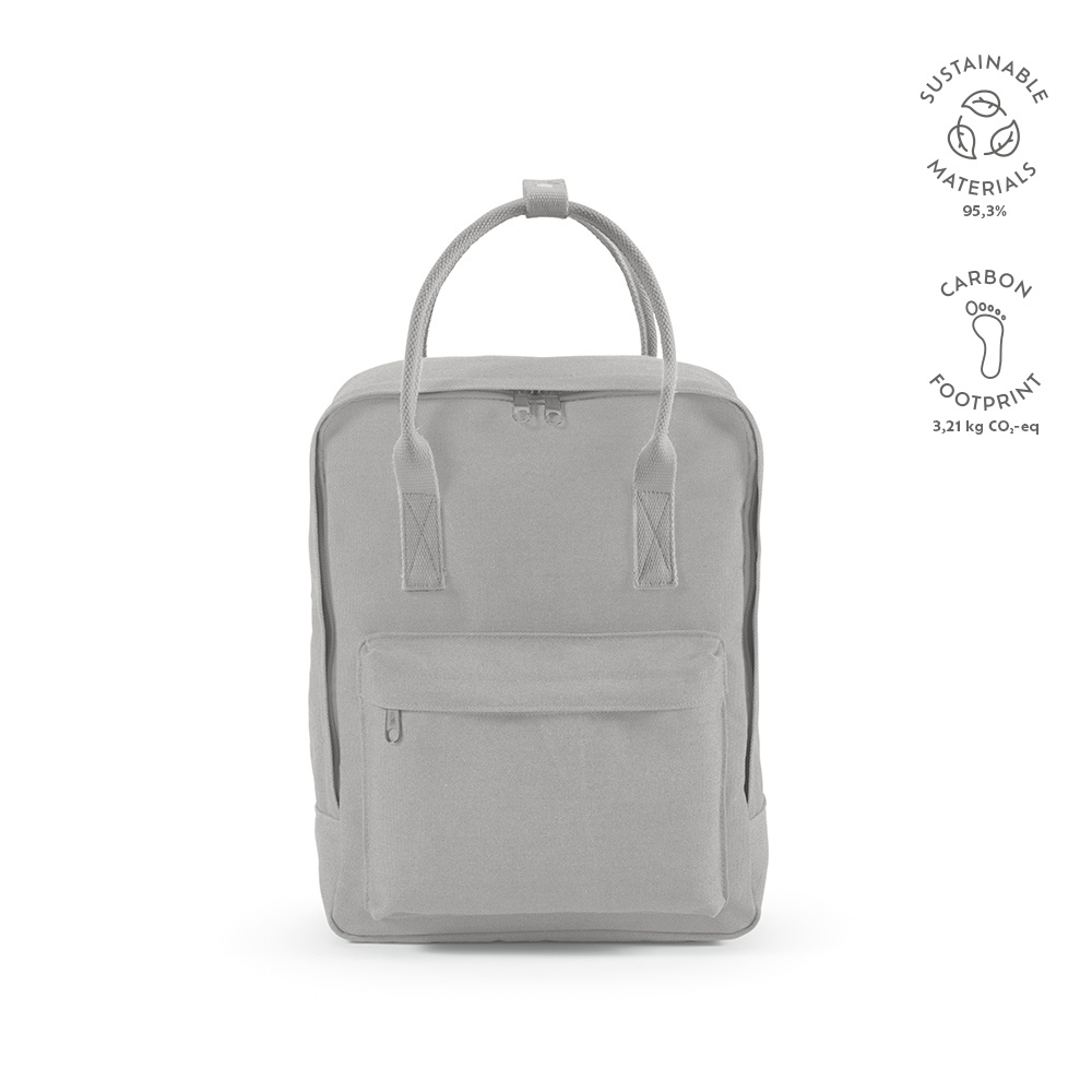 Wykonany z bawełnianego płótna z recyklingu (450 g/m²), ten plecak o pojemności 18 litrów jest przykładem zrównoważonego rozwoju. Posiada dwa uchwyty umieszczone dla większej wygody i paski na ramię z rPET. Posiada również przednią kieszeń. Zapakowany w torbę PE z recyklingu.