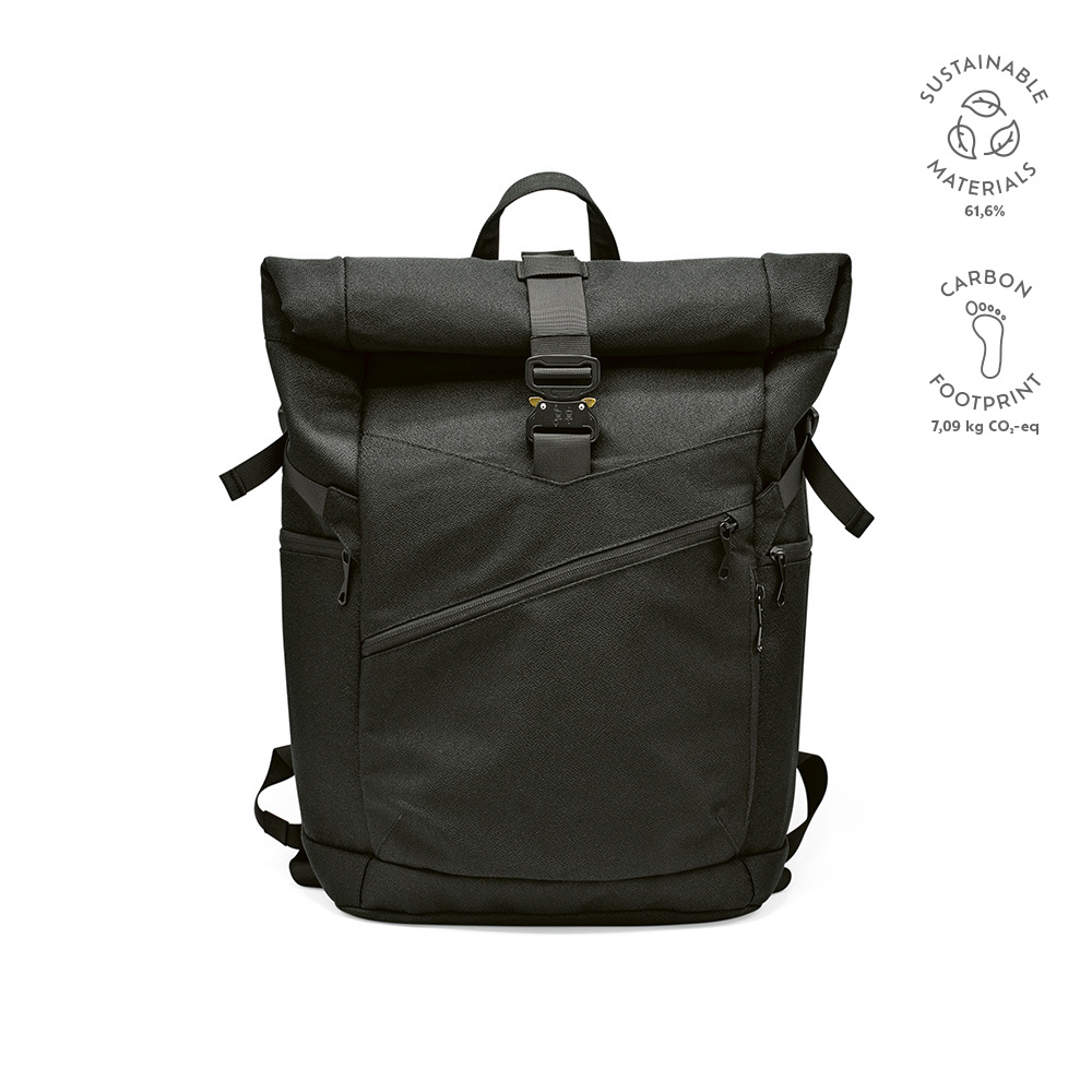 Skrupulatnie zaprojektowany plecak o pojemnosci 28 litrów jest wykonany z materialu rPET. Posiada wysokiej jakosci zapiecie na rolowana klamre. Na wyscielanych plecach znajduje sie pasek do wózka i ukryta kieszen. Wzmocniony uchwyt i paski. Pakowane indywidualnie w torby polietylenowe z recyklingu.