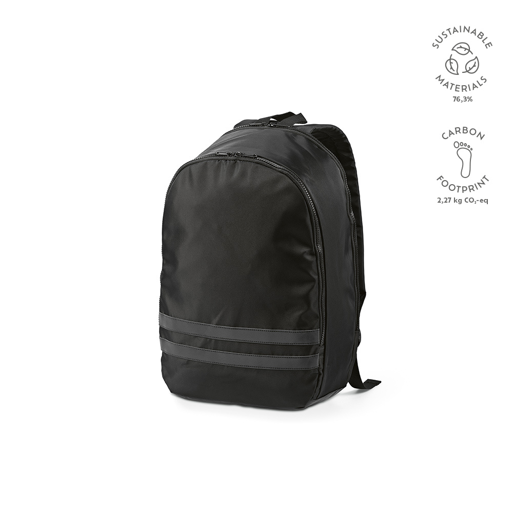 Nasz plecak rPET 18L jest ucielesnieniem zrównowazonego rozwoju. Jedna duza kieszen glówna i druga przeznaczona na laptopa z wbudowanym neoprenowym rekawem (17"). Na zewnatrz dwa odblaskowe czarne paski zwiekszaja widocznosc. Oba zamki blyskawiczne sa termowtryskiwane.