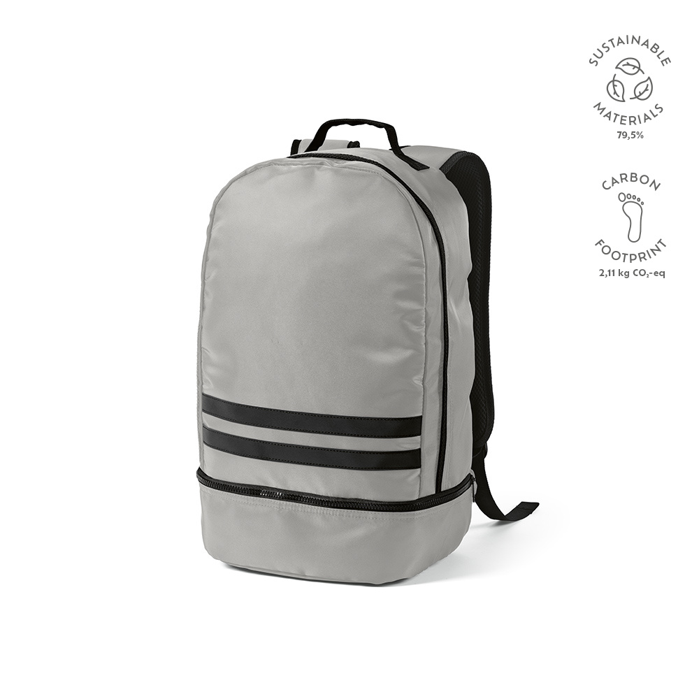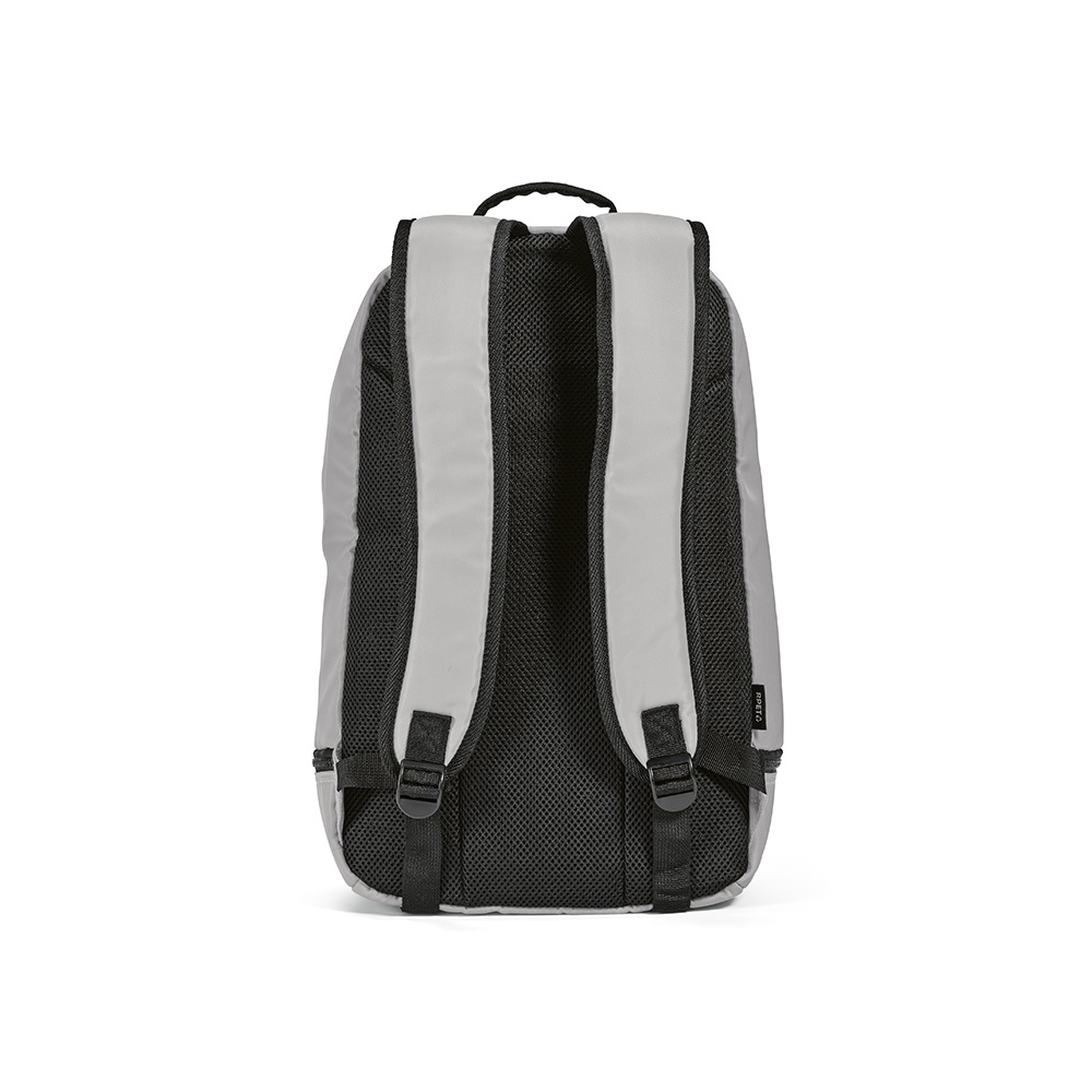 Wykonany z rPET, ten 25-litrowy plecak został zaprojektowany w oparciu o funkcjonalność. Z wyściółką pleców, wzmocnionym górnym uchwytem i dwoma czarnymi odblaskowymi paskami z przodu dla bezpieczeństwa. Na spodzie znajduje się oddzielna kieszeń idealna na buty. Projekt ukierunkowany na funkcjonalność.