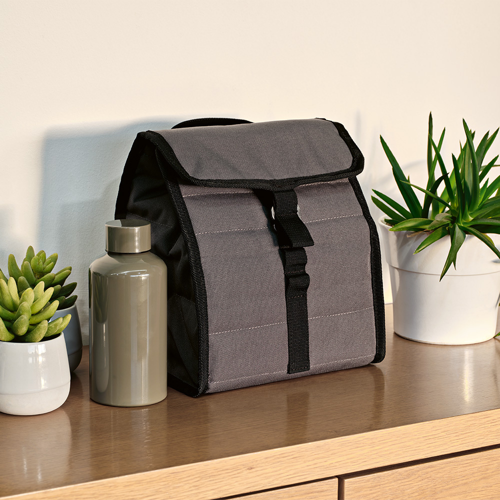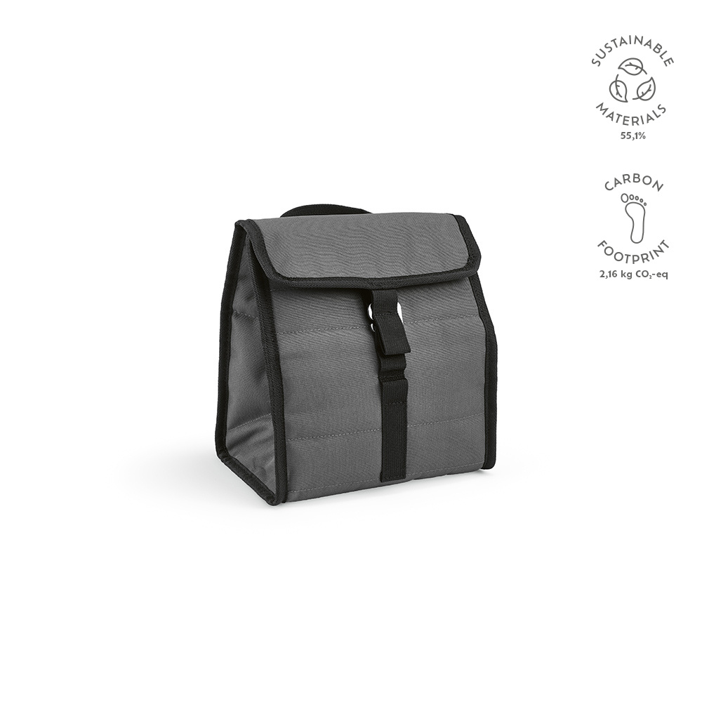 Chłodne napoje dzięki naszej chłodziarce rPET z eleganckimi czarnymi wykończeniami. Zaprojektowany z myślą o ekologii, jego tkanina pochodzi z materiałów pochodzących z recyklingu. Zwijane zamknięcie zapewnia łatwy dostęp, a górny uchwyt ułatwia przenoszenie.