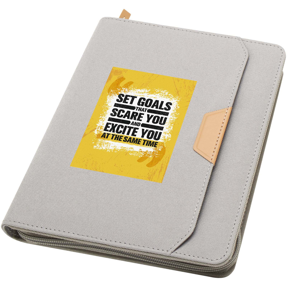 Teczka z notatnikiem do pisania Nomumi w formacie A5 o zaokrąglonych rogach to poręczny i niezbędny w biurze gadżet, wykonany z plastiku pochodzącego z