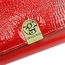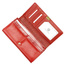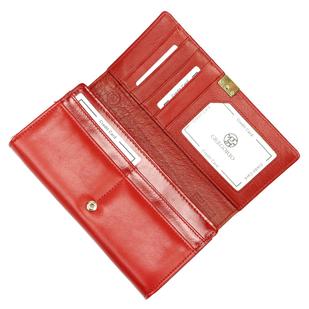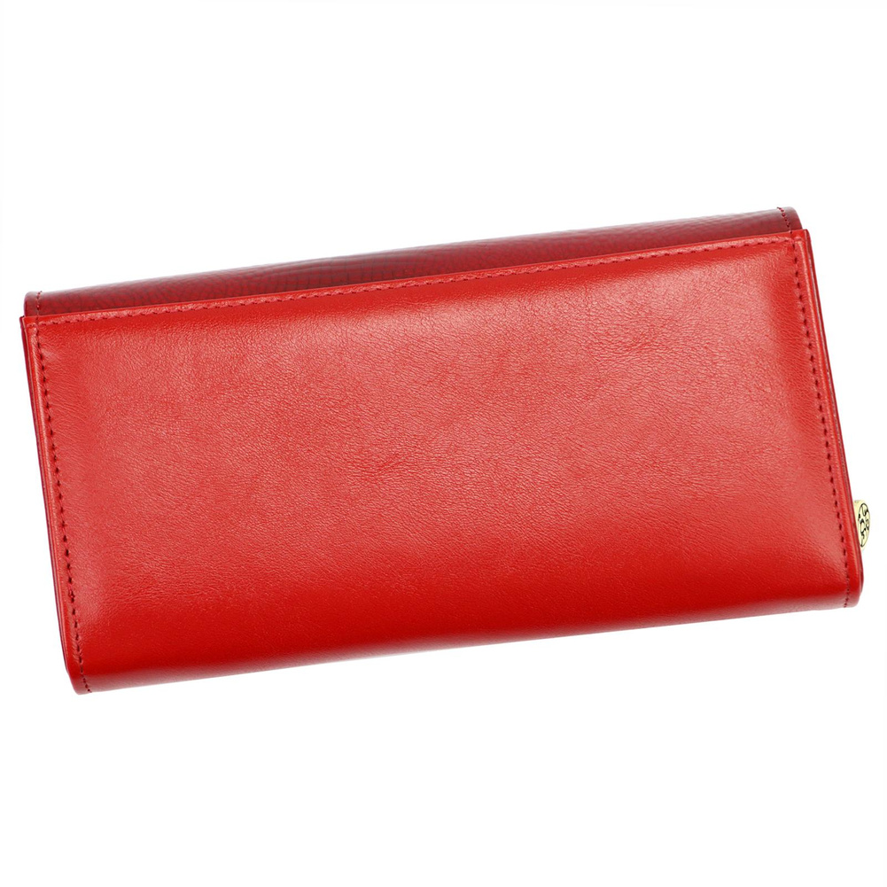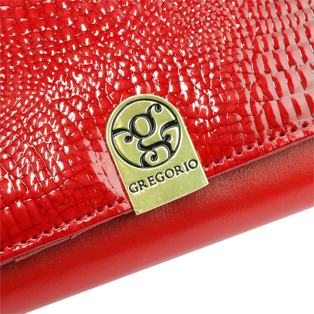 Duży portfel damski, wykonany z najwyższej jakości naturalnej, włoskiej skóry licowej, częściowo wytłoczonej w rysunek skóry krokodyla i lakierowanej. Budowa portfela: - orientacja pozioma, - dwie przegrody na banknoty (w jedną z przegród wszyto kieszonkę zapinaną na suwak), - osiem przegródek na karty magnetyczne, - "okienko" na zdjęcie, - kieszeń na drobne, podzielona na dwie części, zamykana na zamek błyskawiczny, - całość zamykana klapą z ozdobnym zatrzaskiem.