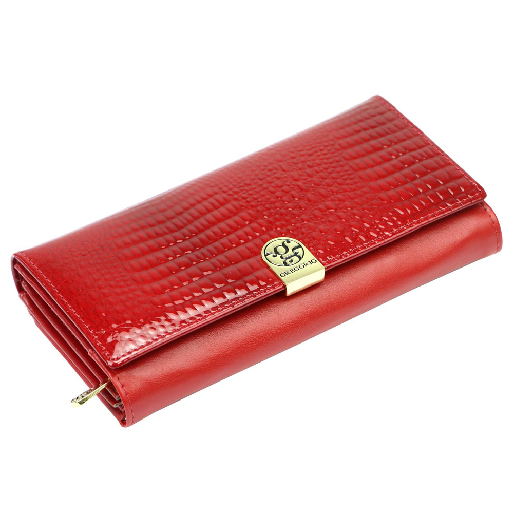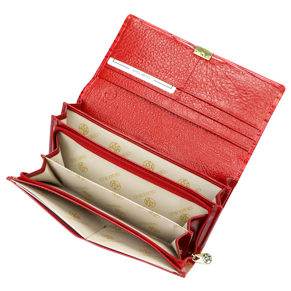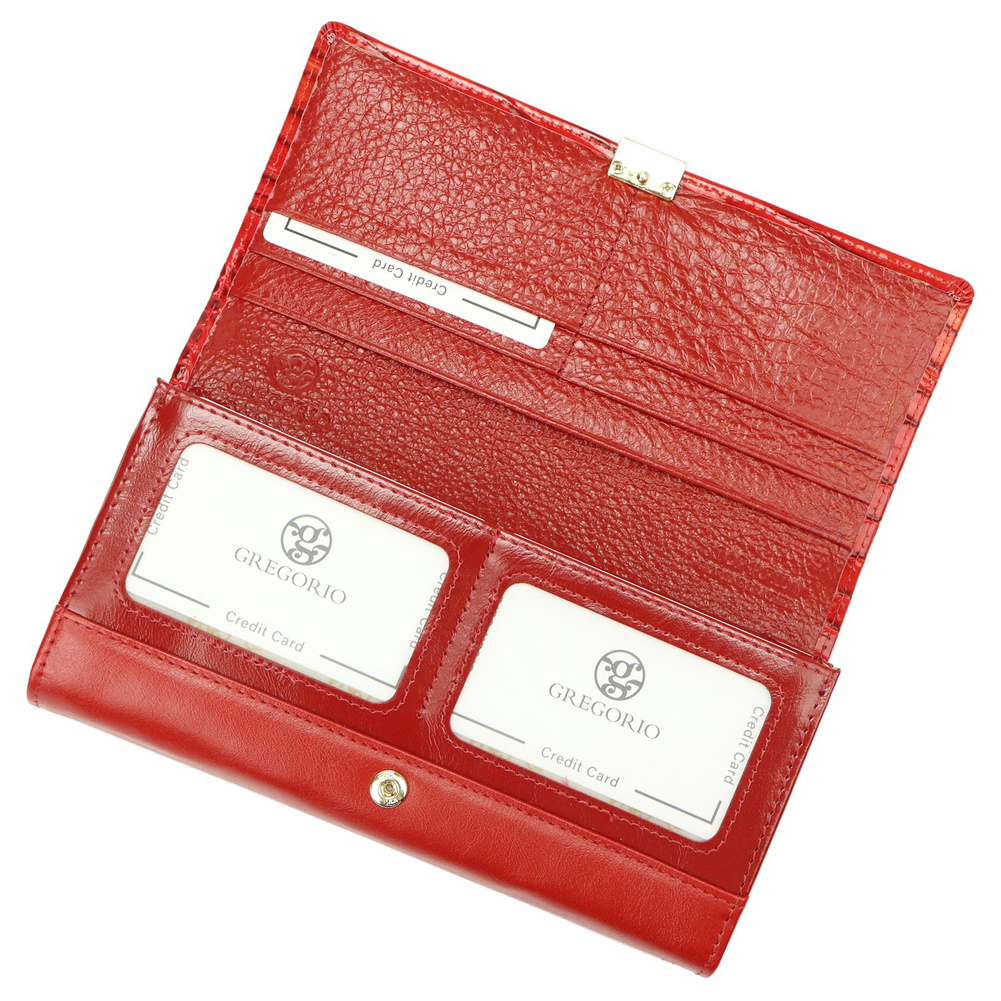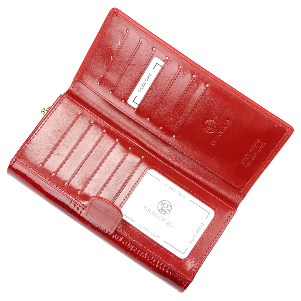 Duży portfel damski, wykonany z najwyższej jakości naturalnej, włoskiej skóry licowej, częściowo wytłoczonej w rysunek skóry krokodyla i lakierowanej. Budowa portfela: - orientacja pozioma, - dwie przegrody na banknoty, - szesnaście przegródek na karty magnetyczne, - trzy "okienka" na zdjęcie, - kieszeń na drobne, podzielona na dwie części, zamykana na zamek błyskawiczny, - całość zamykana klapą z zatrzaskiem.