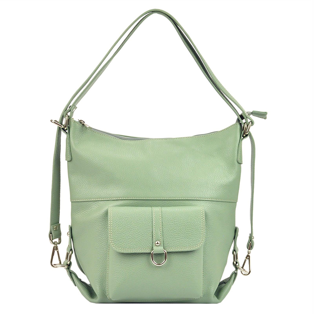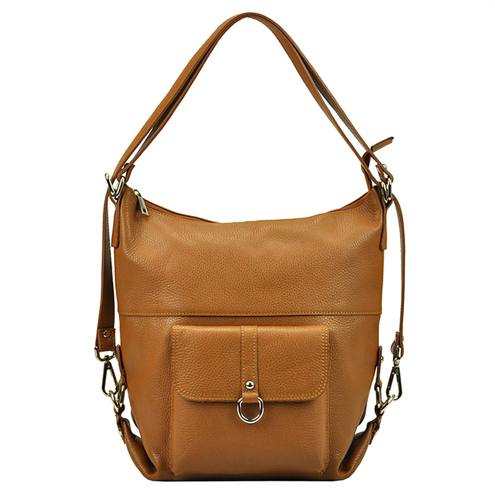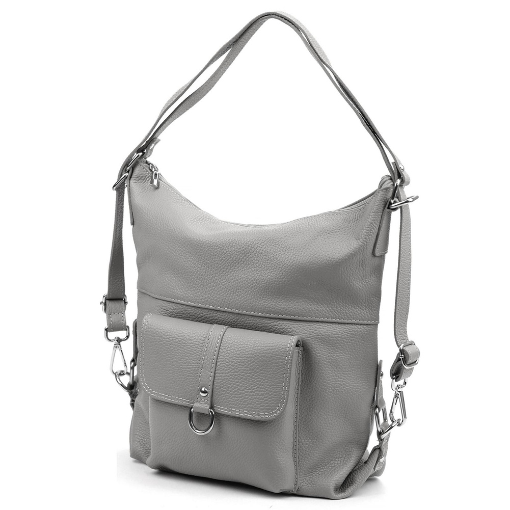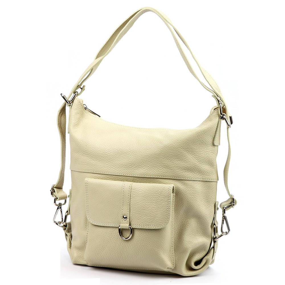Pojemna, mieszcząca A4. torba z funkcją plecaka. Wykonana jest z najwyższej jakości, włoskiej, naturalnej skóry o wyrazistym "groszkowaniu". Konstrukcja torebki jest jednokomorowa. Wnętrze wykończono trwałą podszewką, w którą wszyto kieszeń-przegrodę, zapinaną na suwak. kieszonkę na telefon i kieszonkę na drobiazgi. Całość zamykana jest solidnym, metalowym zamkiem błyskawicznym. Paski tworzące uchwyt można przepiąć wydłużając je dwukrotnie lub też w ten sposób, by można było nosić torebkę jak plecak.