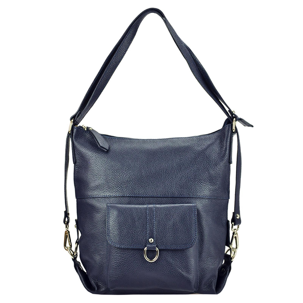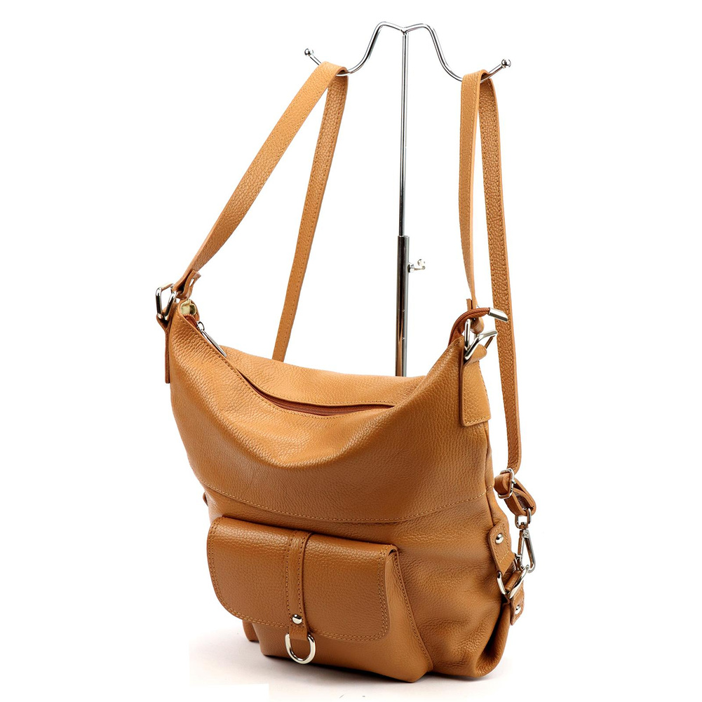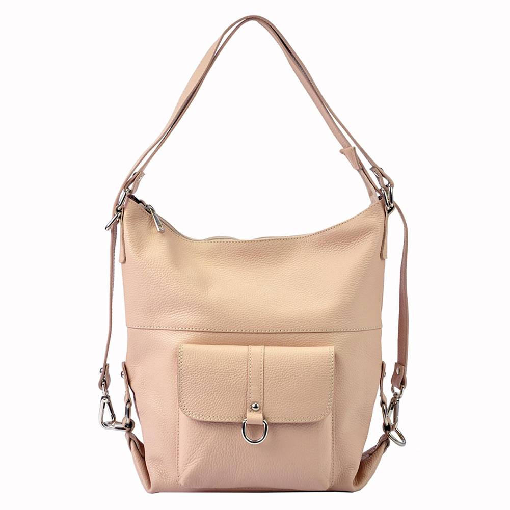 Pojemna, mieszcząca A4. torba z funkcją plecaka. Wykonana jest z najwyższej jakości, włoskiej, naturalnej skóry o wyrazistym "groszkowaniu". Konstrukcja torebki jest jednokomorowa. Wnętrze wykończono trwałą podszewką, w którą wszyto kieszeń-przegrodę, zapinaną na suwak. kieszonkę na telefon i kieszonkę na drobiazgi. Całość zamykana jest solidnym, metalowym zamkiem błyskawicznym. Paski tworzące uchwyt można przepiąć wydłużając je dwukrotnie lub też w ten sposób, by można było nosić torebkę jak plecak.