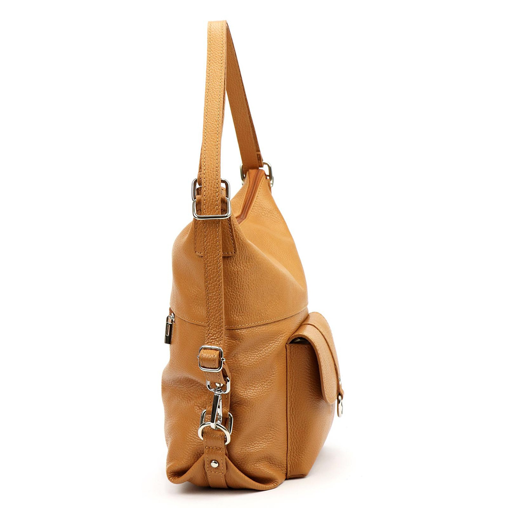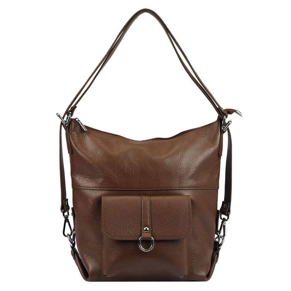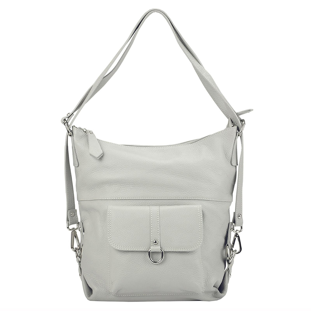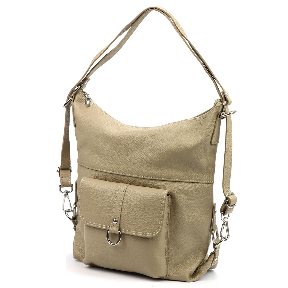 Pojemna, mieszcząca A4. torba z funkcją plecaka. Wykonana jest z najwyższej jakości, włoskiej, naturalnej skóry o wyrazistym "groszkowaniu". Konstrukcja torebki jest jednokomorowa. Wnętrze wykończono trwałą podszewką, w którą wszyto kieszeń-przegrodę, zapinaną na suwak. kieszonkę na telefon i kieszonkę na drobiazgi. Całość zamykana jest solidnym, metalowym zamkiem błyskawicznym. Paski tworzące uchwyt można przepiąć wydłużając je dwukrotnie lub też w ten sposób, by można było nosić torebkę jak plecak.