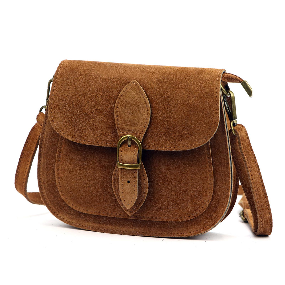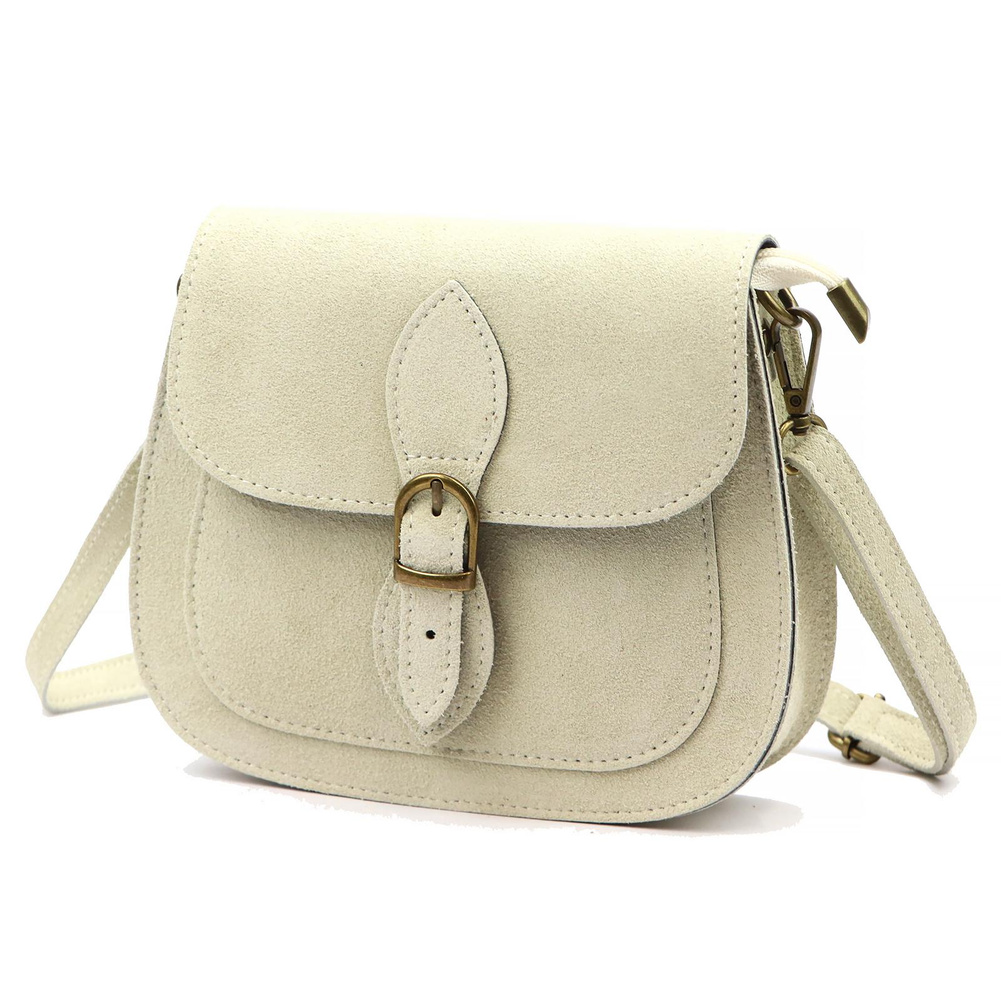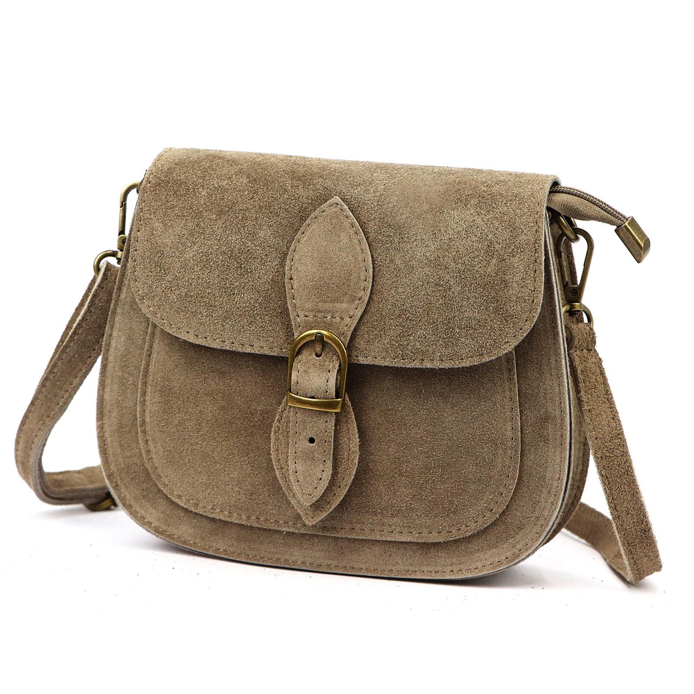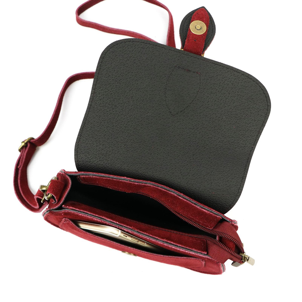 Mała torebka-listonoszka z naturalnej skóry zamszowej. Torebka ma budowę jednokomorową, wykończoną trwałą podszewką. Na froncie naszyta jest kieszeń, mieszcząca smartfon. Całość zamykana jest zamkiem błyskawicznym i klapą z zatrzaskiem magnetycznym. Długi pasek pozwala wygodnie nosić ją na ramieniu lub na ukos przez pierś.